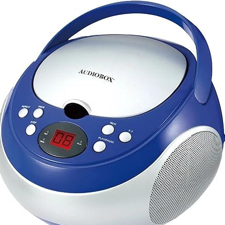 The Audiobox Portable CD Player with Radio AM/FM CDX-100 features a top loading design, stereo sound, and a text display function. With a programmable memory for up to 20 tracks, you can easily program, skip, pause, and repeat your favorite songs. This player also includes an aux-in jack, rotary volume control, and 2-way power options with both DC battery power and AC power capabilities.