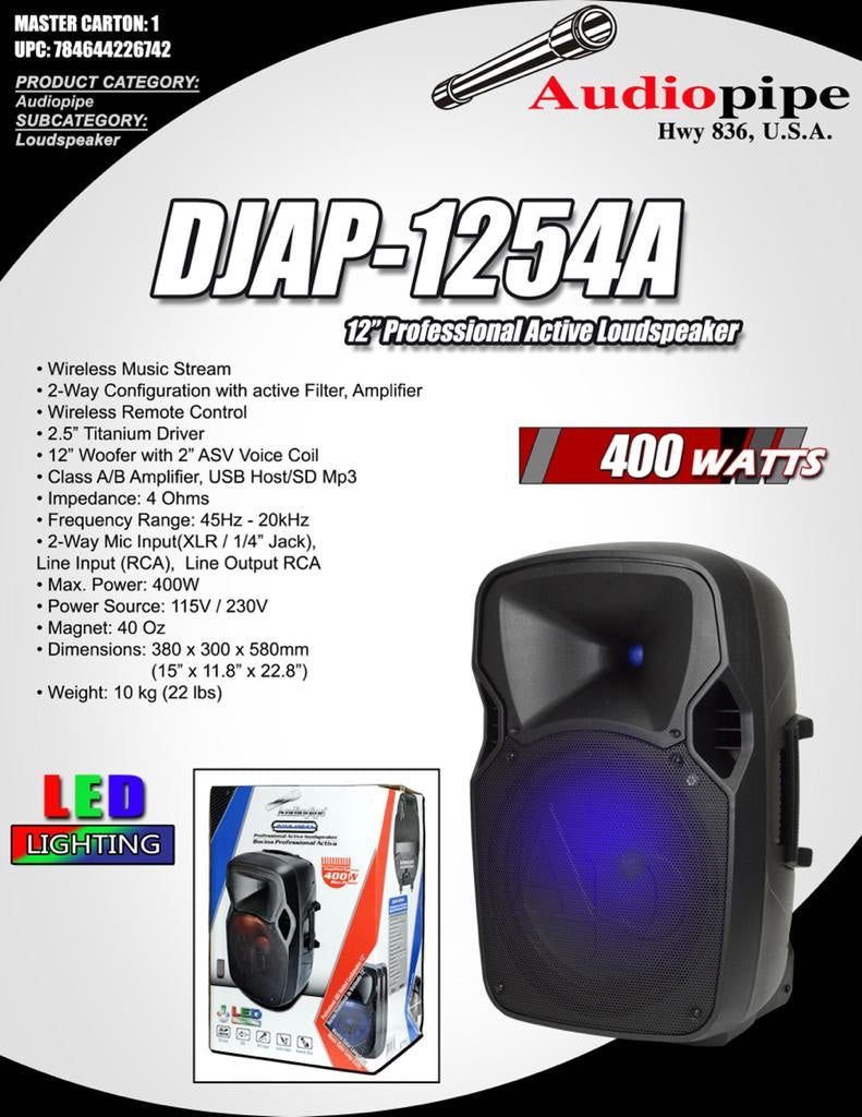 Specifications• wireless music stream• 2-way configuration with active filter, amplifier• wireless remote control• 2.5” titanium driver• 12” woofer with 2” asv voice coil• class a/b amplifier, usb host/sd mp3• impedance: 4 ohms• frequency range: 45hz - 20khz• 2-way mic input(xlr / 1/4” jack), line input (rca), line output rca• max. power: 400 watts• power source: 115v / 230v• magnet: 40 oz.• dimensions: 380 x 300 x 580mm (15” x 11.8” x 22.8”)• weight: 10 kg (22 lbs)