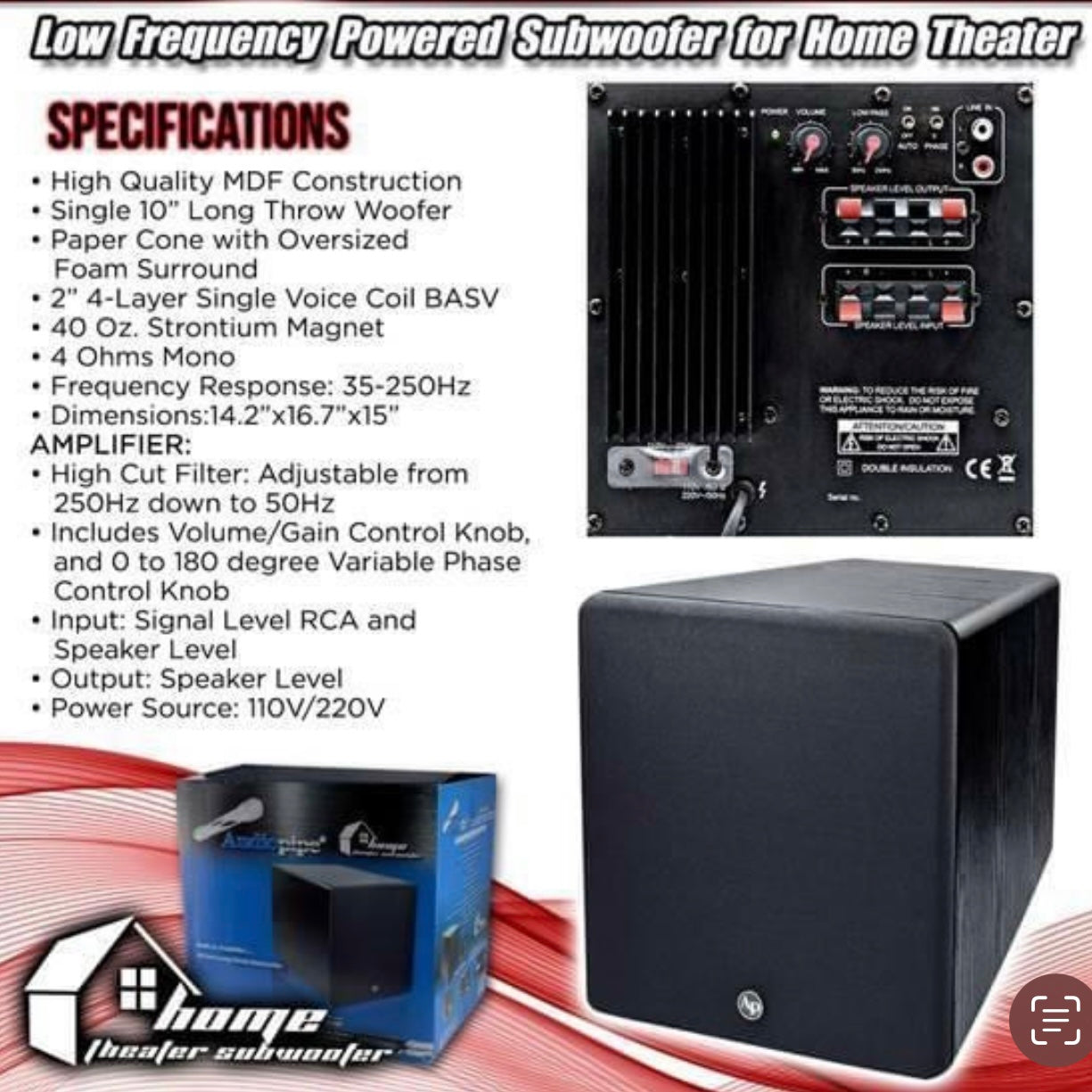 Audipipe low frequency powered home theater subwooferitem number: sb-w350high-quality mdf constructionsingle 10” long throw wooferpaper cone with oversized foam surround2” 4-layer single voice coil basv40 oz. strontium magnet4 ohms monofrequency response: 35-250hzdimensions:14.2”x16.7”x15”amplifier:high cut filter: adjustable from 250hz down to 50hzincludes volume/gain control knob, and 0 to 180 degree variable phase control knobinput: signal level rca and speaker leveloutput: speaker levelpower source: 110v/220v