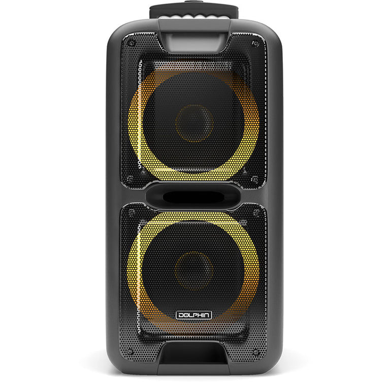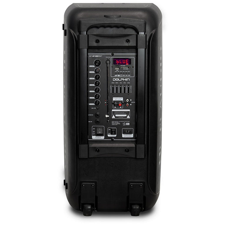 Introducing the Dolphin SP-2100RBT Dual 10" Party Speaker, perfect for any event. of music power, WaveSync™ technology, and sound-activated multicolor LED lights, this speaker delivers powerful audio and a dynamic light show. With Bluetooth, USB, SD, TF, FM, and AUX inputs, plus a built-in handle and wheels for easy transport, it's the ultimate party companion.