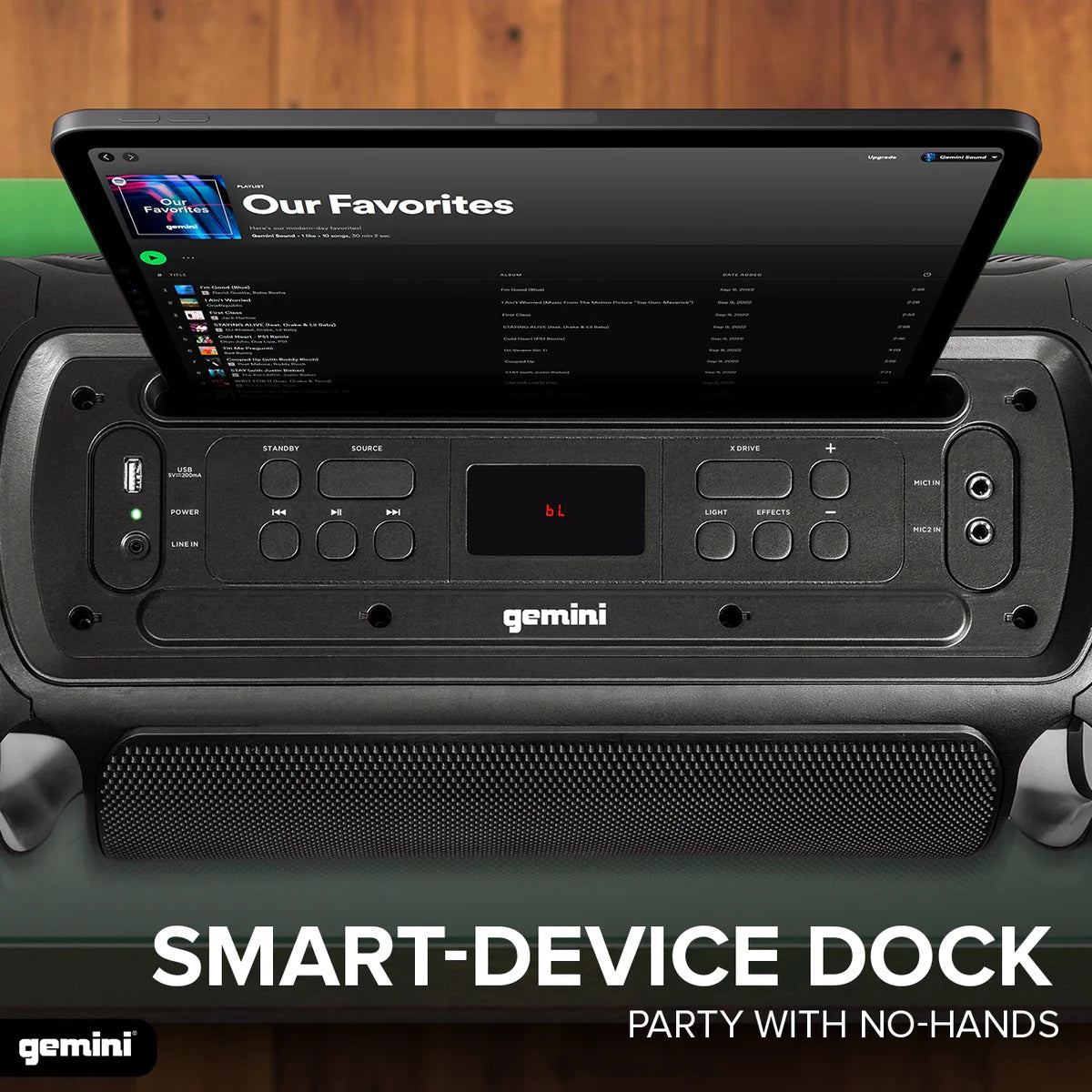 The Gemini GSYS series has a fresh look! Introducing a sleek new modern design to our legendary home stereo systems that deliver the earth-shaking yet clear sound that you expect from Gemini. With the GSYS-4800, enjoy assorted onboard audio playback options or connect virtually any audio source via auxiliary input. Bluetooth® audio streaming plays all your favorite songs wirelessly or play your music collection from the USB and SD card inputs or connect virtually any audio device directly into the 1/8” aux input. Or use FM Radio to tune in to the local sounds. 3000 watts of clean power drive dual 12” subwoofers, a 6.5” mid frequency woofer plus 2 high frequency tweeters (3” & 1”) to deliver pristine full range sound. Built-in LED party lighting with selectable modes and colors add visual effects to the beat, creating a truly dazzling display that will add vibes to any party! With an included microphone this is a great system for house parties, perfect for all your music and crowd control needs. Display slot for your tablet on the top of the head unit makes Karaoke a breeze. With huge sound and fully loaded with features, this is the ultimate home party system.