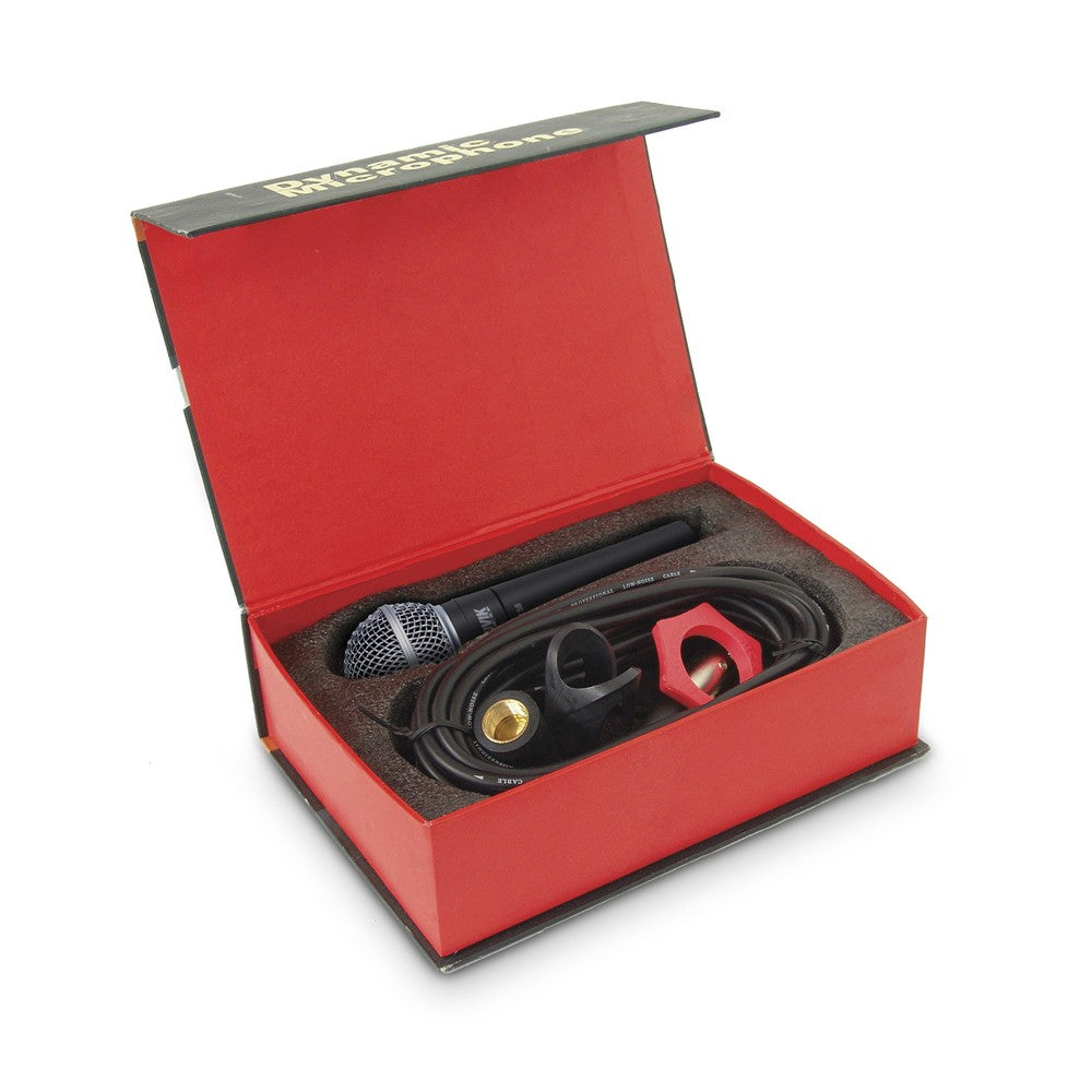 It features a cardioid polar pattern that isolates the main sound source and reduces background noise pickup. With its metal body, it is resistant to any type of use over the years, constructively designed to reduce noise induced by sudden movements of the artist or presenter. Includes a pipette and XLR to ¼” Plug cable.