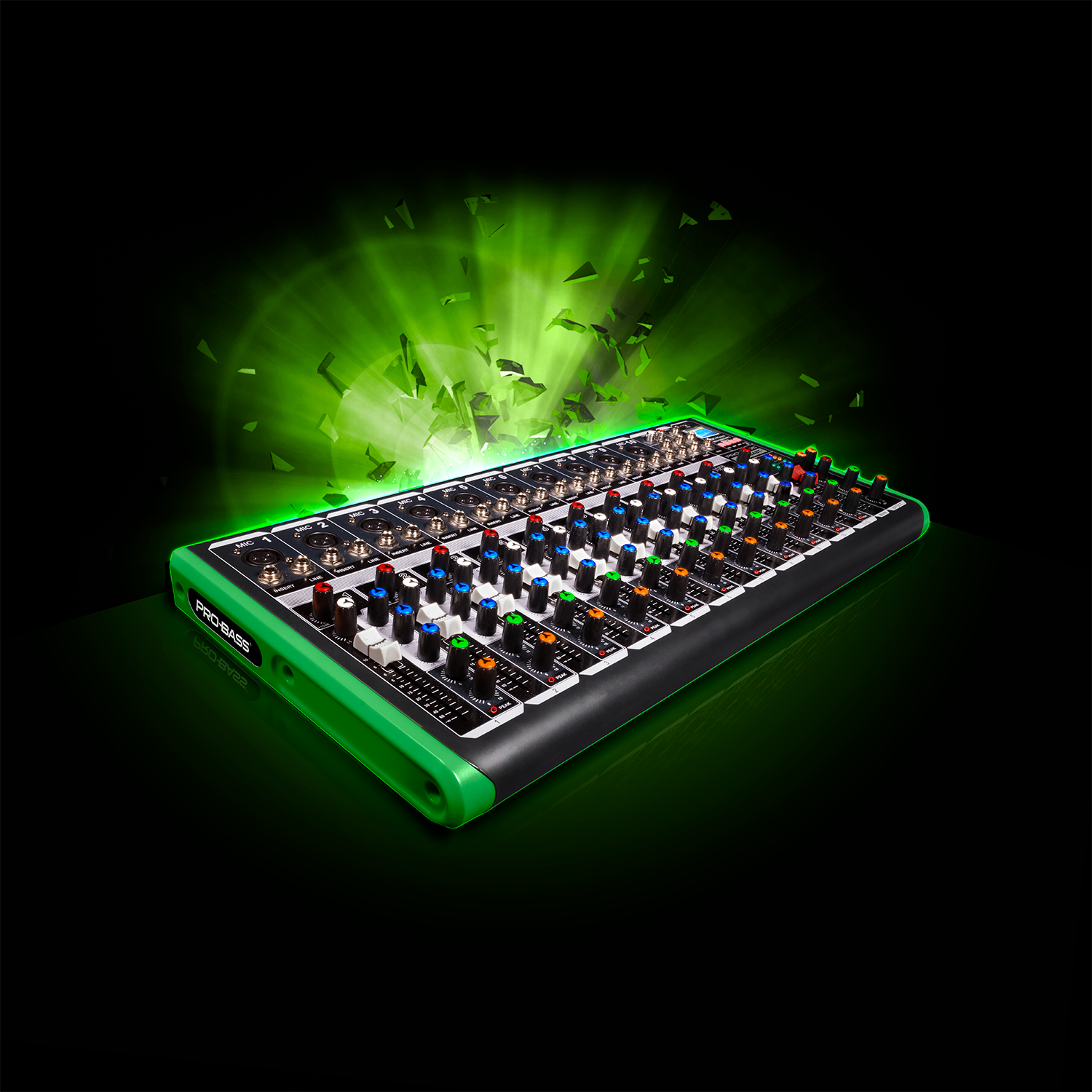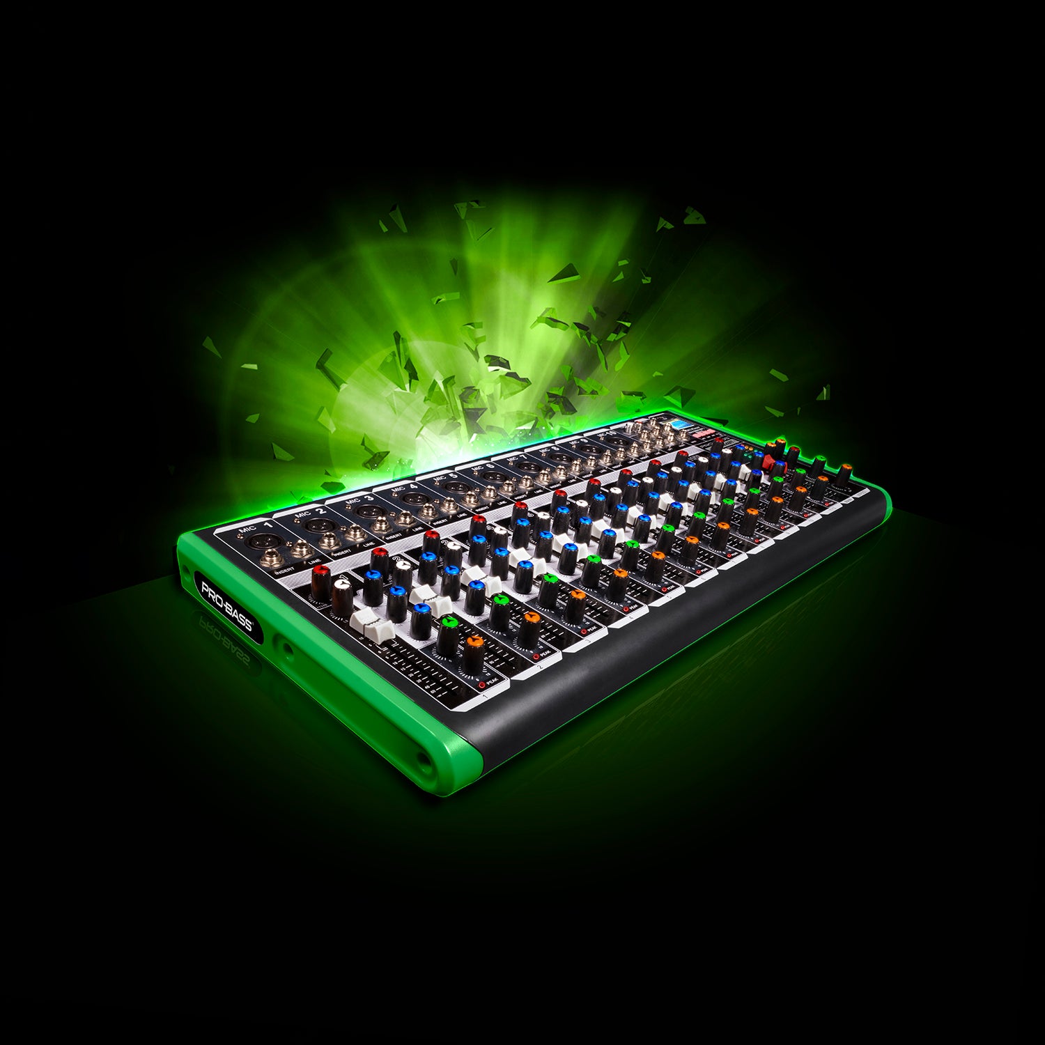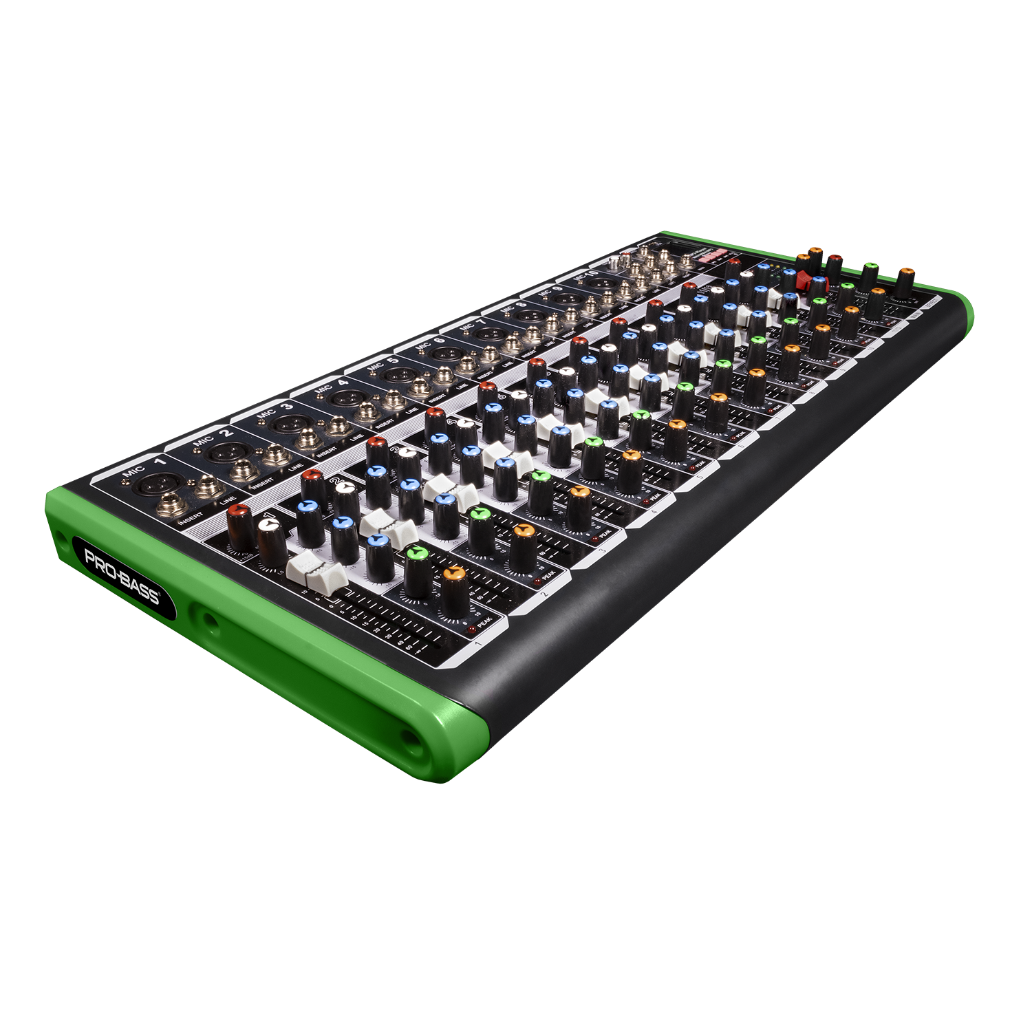 The Pro Bass Mixing Console PM-1624BT offers 12channels equipped with microphone pre-amplifiers and phantom power (+48V) on two stereo channels, ensuring clear and professional sound capture. Each channel features peak LEDs for precise level monitoring, while auxiliary monitor sends and post-fader effects provide flexible sound control. Integrated Bluetooth and USB/MP3 player capabilities allow seamless wireless audio streaming and playback, making this console ideal for expert users seeking versatile and high-quality mixing performance.