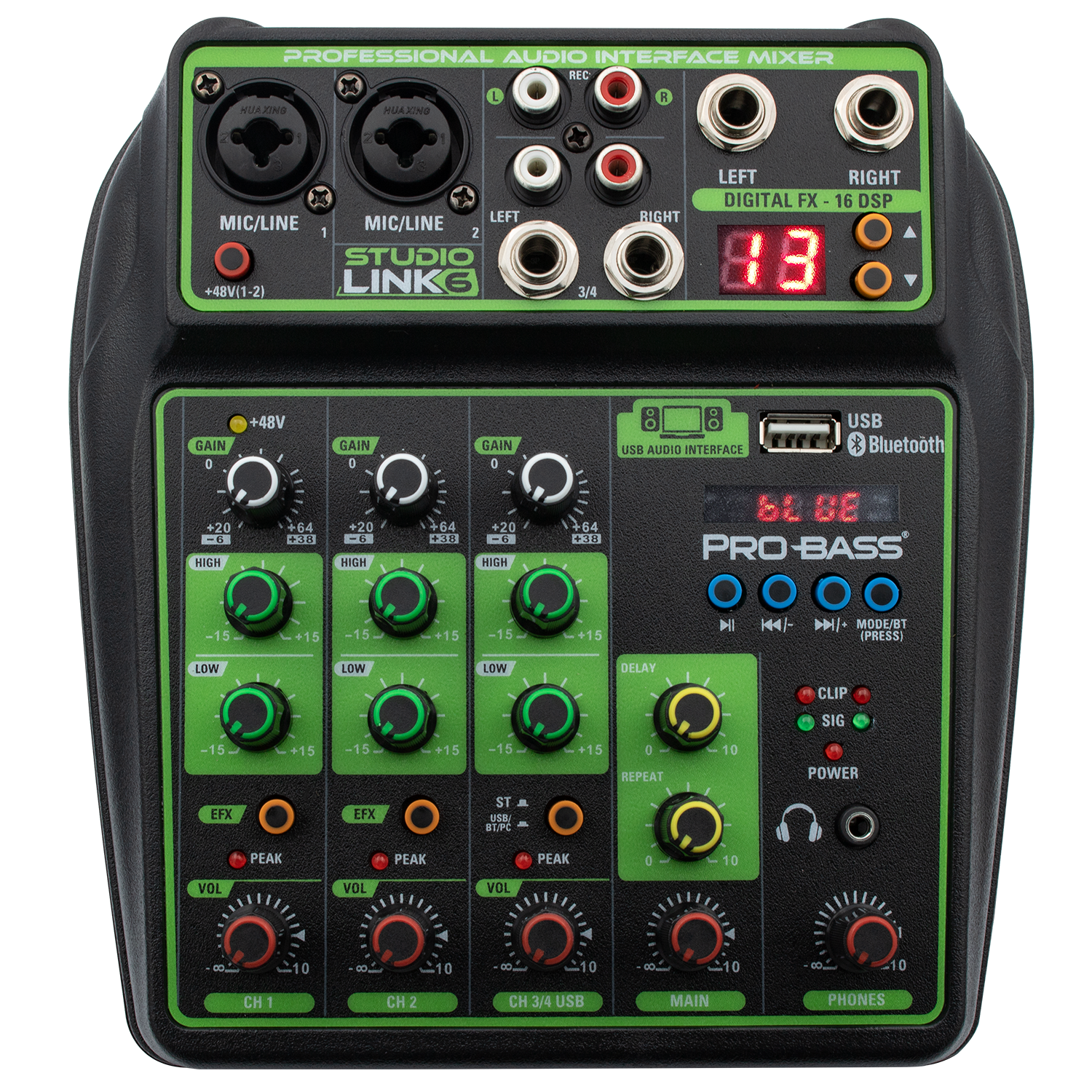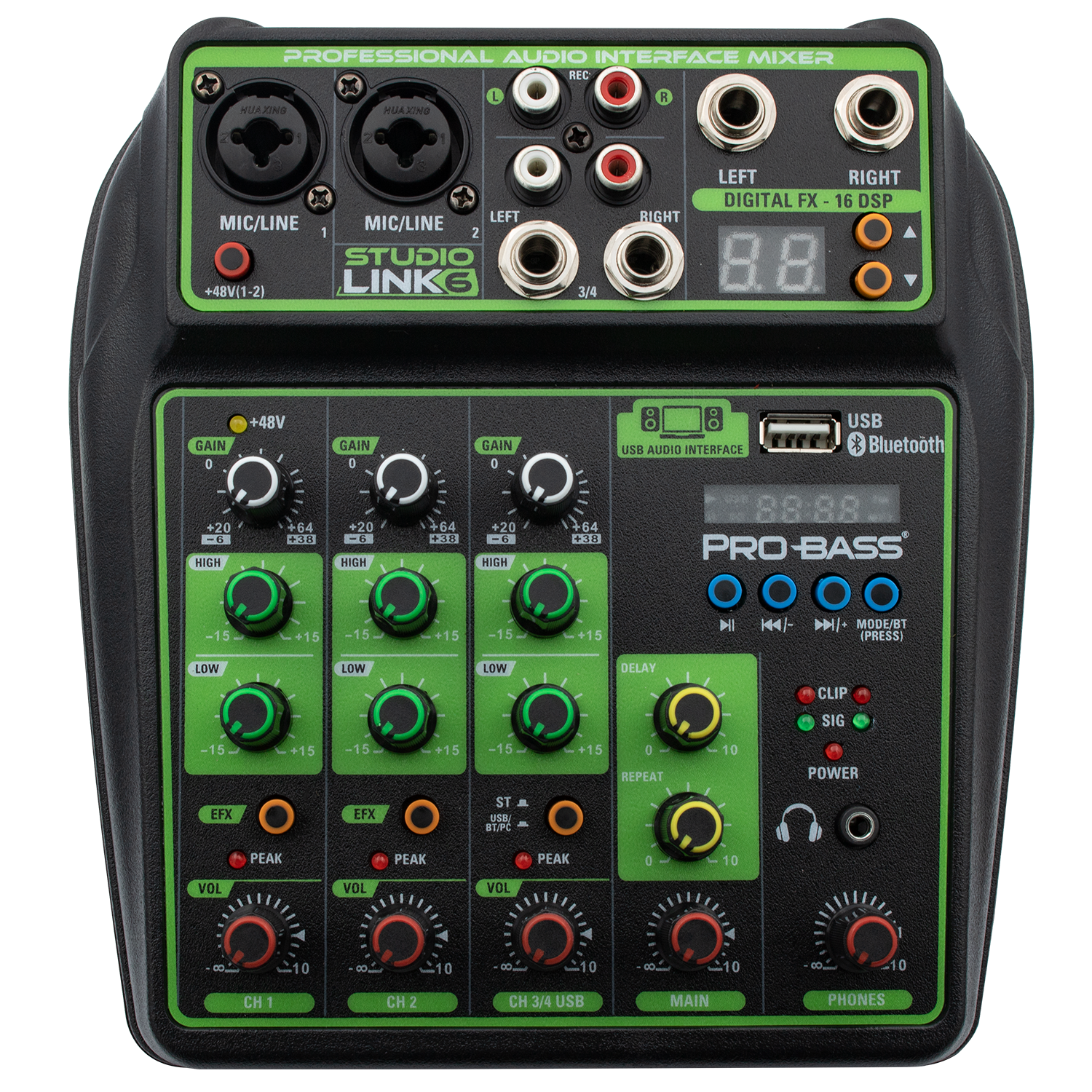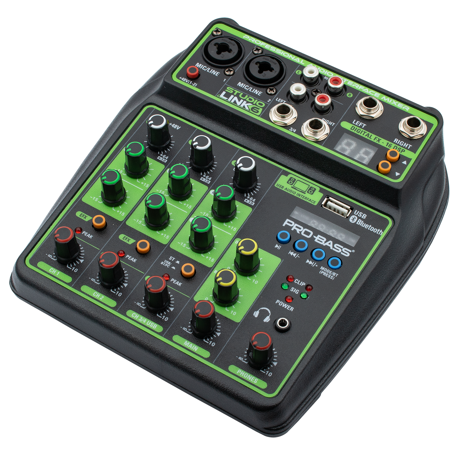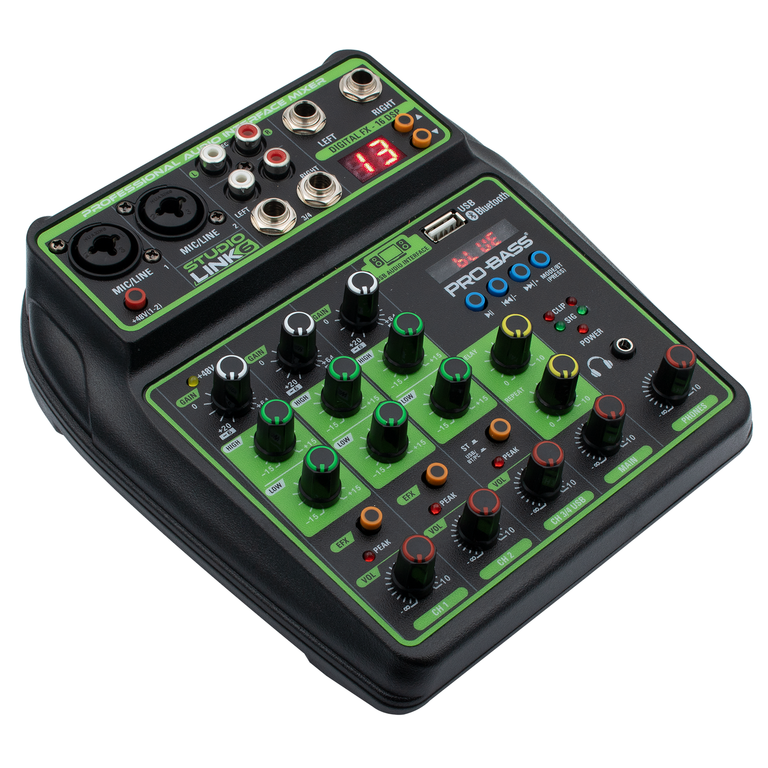 The Pro Bass Professional 6CH Mixer STUDIO-LINK6 delivers expert-level audio mixing with six channels and 16 built-in digital effects. Its Bluetooth connectivity and USB port support seamless streaming, recording, and MP3 playback. Featuring Phantom Power and a two-band EQ per channel, this compact mixer ensures precise sound control for podcasts, live broadcasts, and online content creation. Designed for professionals and enthusiasts, it combines portability with advanced functionality to elevate your audio production.
