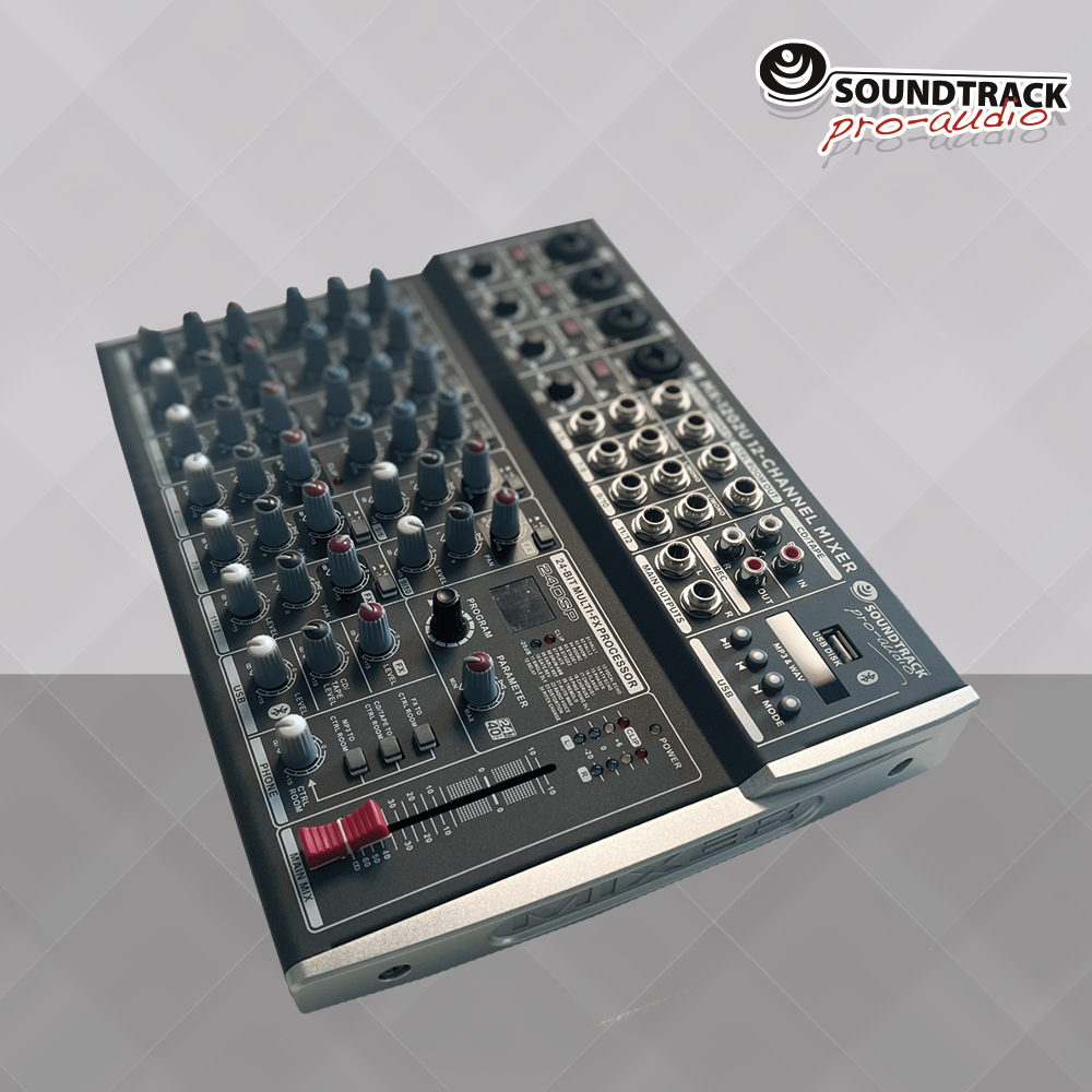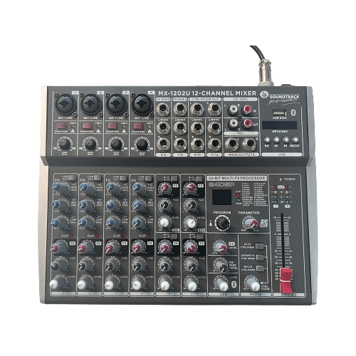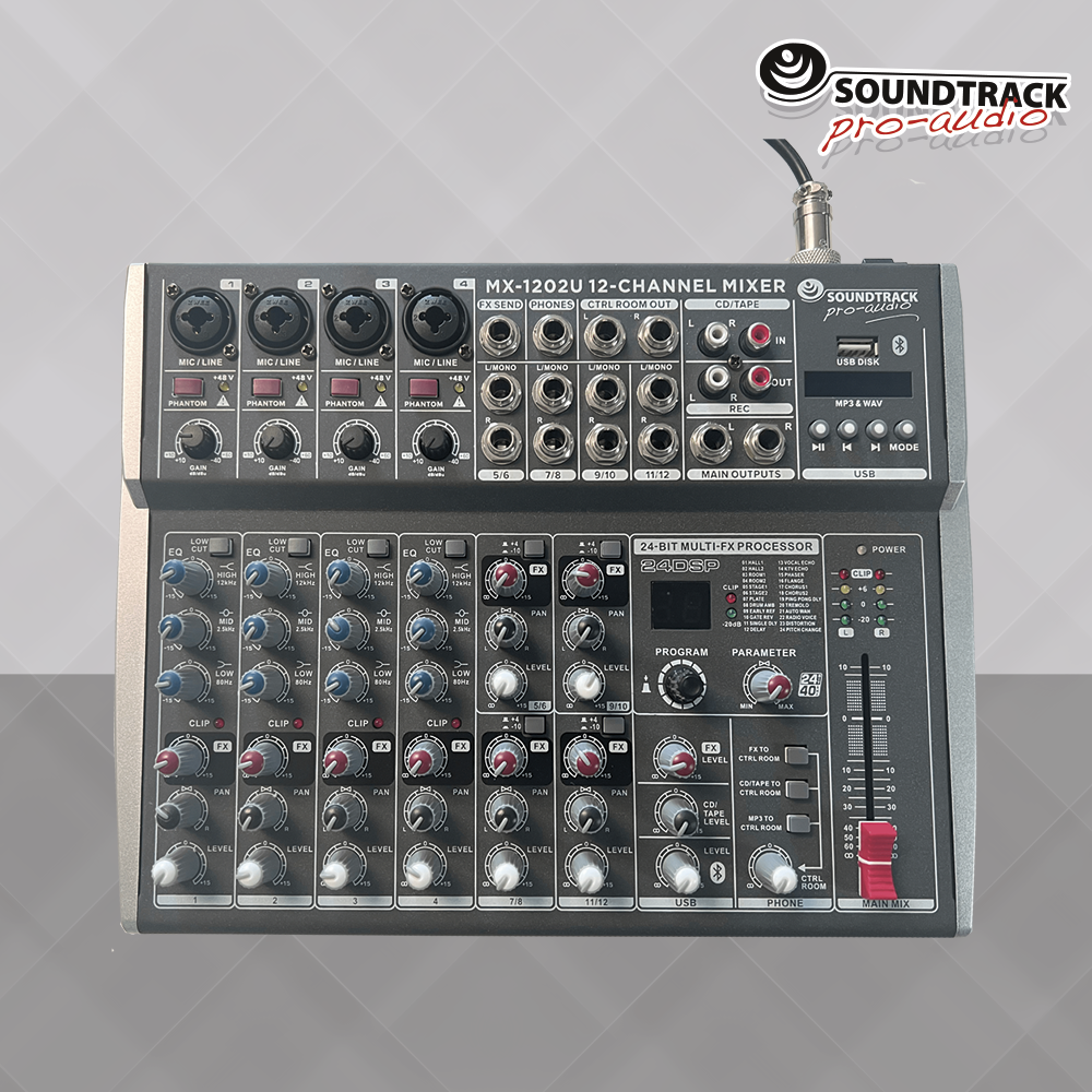 Expertly mix sound with the Soundtrack 12Ch Mixing Console MX-1202U. This professional passive mixer features 12 balanced inputs, 2 balanced outputs, and phantom power for top-notch sound quality. With 24 dsp effects, including Bluetooth and an mp3 player, you'll have complete control over your audio.