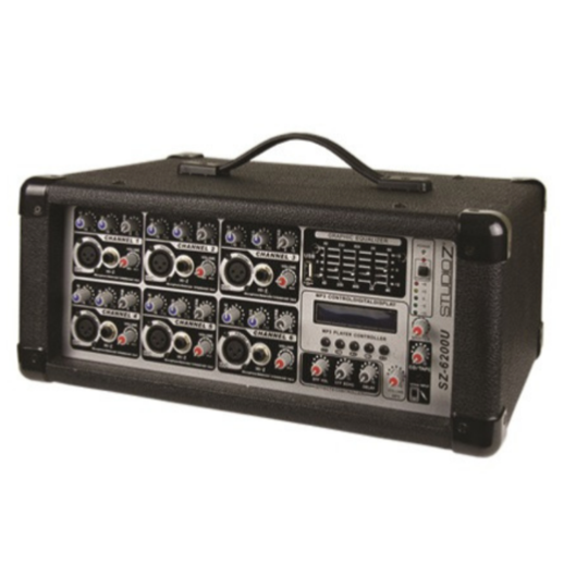 Studio z 6-channel powered mixer with bluetoothproduct number: sz-6300u balanced microphone inputs phantom power6 x ¼” line/high impedance/balanced inputmaster output: 600 watts rms 4 ohmswith usb 2.0 terminal and lcd5-band graphic equalizereffect channel controltape input, rec outputchannel tone adjust (high/low+/-15db)aux/tape/effect feedback inputmaster volume controlphantom +15vac 110/220v selectable