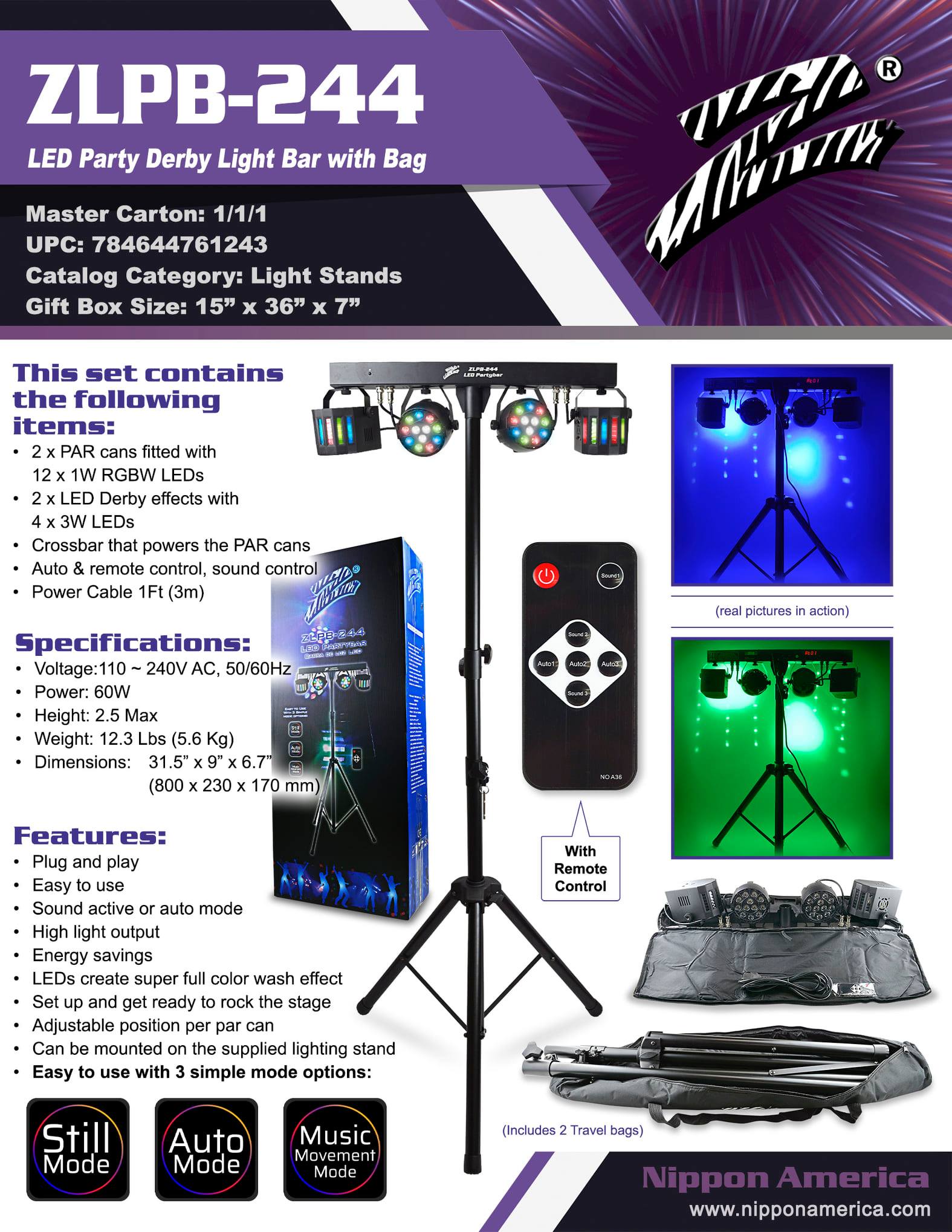 The zlpb-244 led party derby light stand easily turns any room into a club with its double 12 x 1w rgbw leds par cans and double 4 x 3w led derby effect disco lights.just plug and play with three simple mode options; still, auto, and sound control movement that dances with the music.remote control and travel bags are included included!